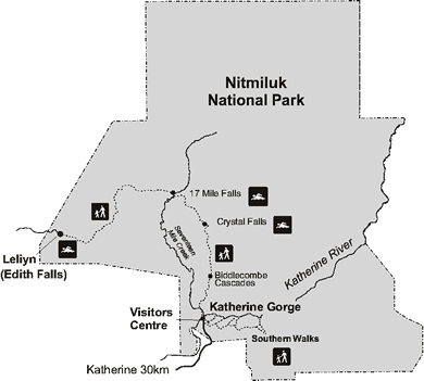 As a safety precaution, all walkers must register with the rangers at the visitors centre. This enables Rangers to organise a search if you fail to arrive at your destination by the due date or time. (Refundable deposits are $1 per day walk, $20 per overnight stays within Gorge, $50 for the 66 km Edith Falls walk). Those on day-hikes must check in again by 6pm.